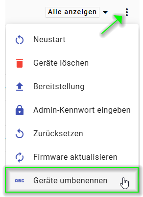 - Klicken Sie auf die drei Punkte oben rechts und wählen Sie anschließend die Funktion Geräte umbenennen: