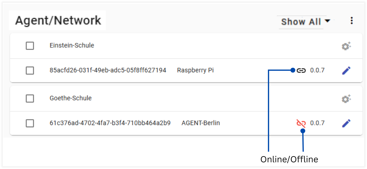 If an agent service fails or communication between the agent and Confire Cloud is interrupted for 5 minutes or longer, the system displays a status indicator in the device view for all devices assigned to that agent: