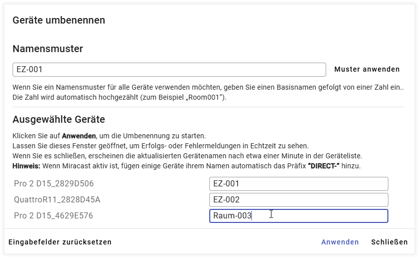 With this function, you can rename multiple devices at the same time using a uniform naming pattern.