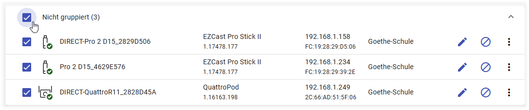 - Select one or more devices. With one click, you can select all devices in a group: