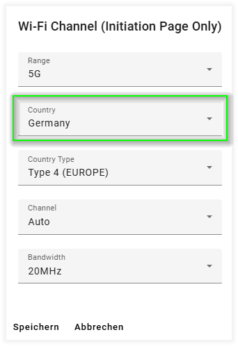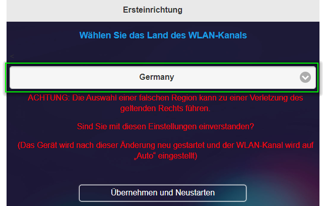 When logging in for the first time via the device’s web settings, the country for the Wi-Fi channel must be selected: